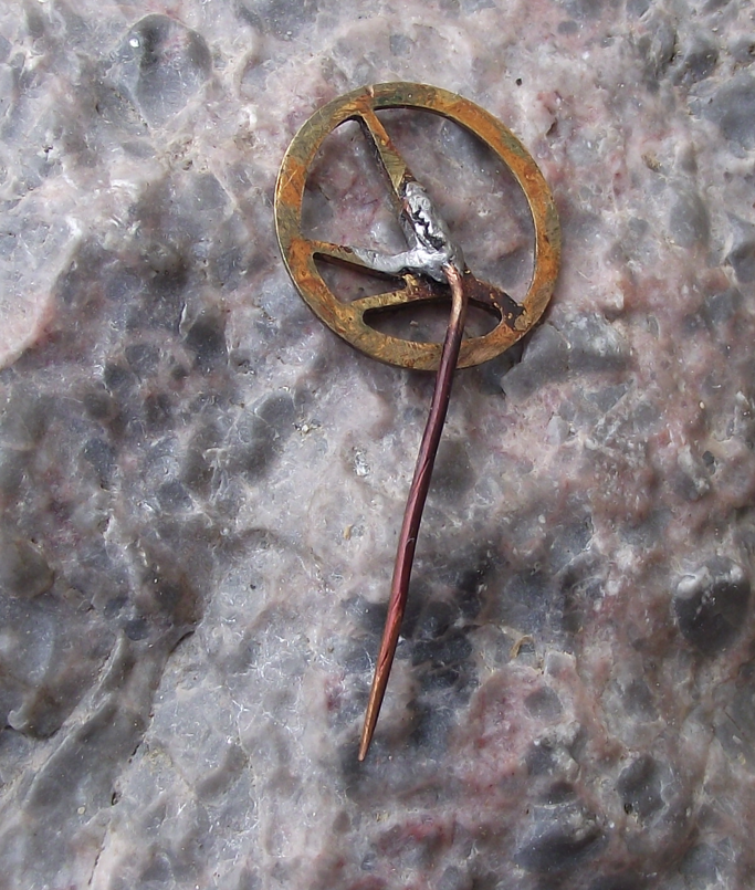 The badge face is 1.6cm wide and has a long, stick pin fastener.