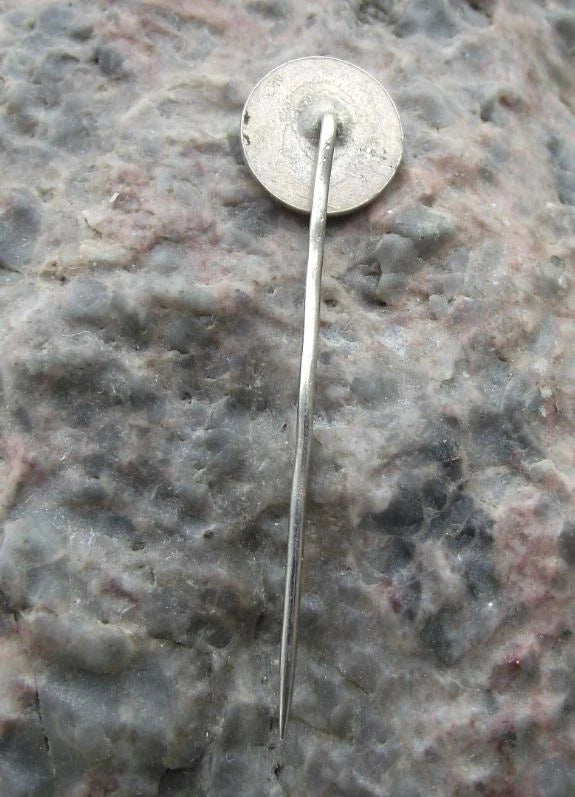 The pin badge is 1.1cm in diameter and has a long, stick pin fastener to the rear.