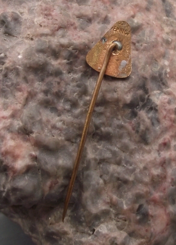 - The badge face is 1.4cm high and has a long stick pin style fastener to the rear.