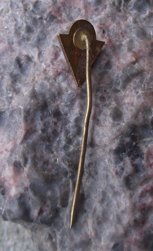 - The badge face is 1.6cm high, made of a gold coloured metal and has a long, stick pin style fastener.