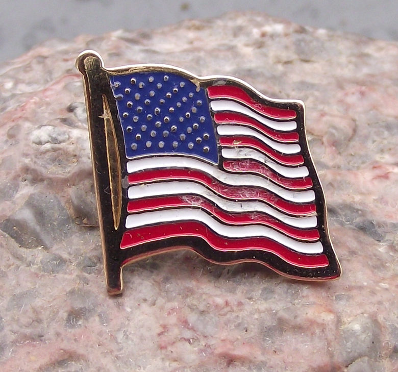 - A gold coloured metal pin from the USA, the badge face is 1.8cm wide and has a safety clasp style fastener to the rear. Featuring the stars and stripes.