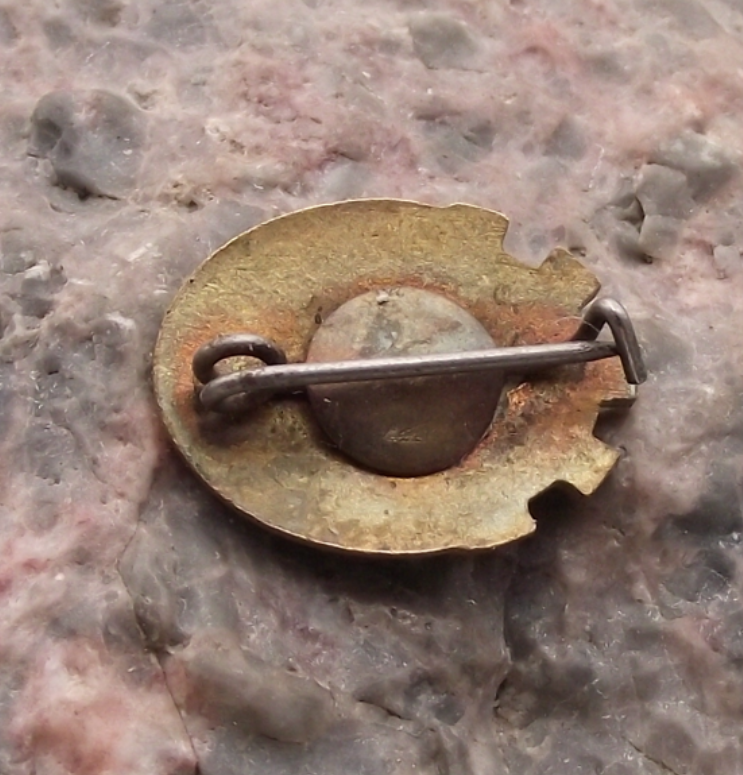 - A gold metal pin badge 2.1cm high with a safety pin style pin fastener to the rear.