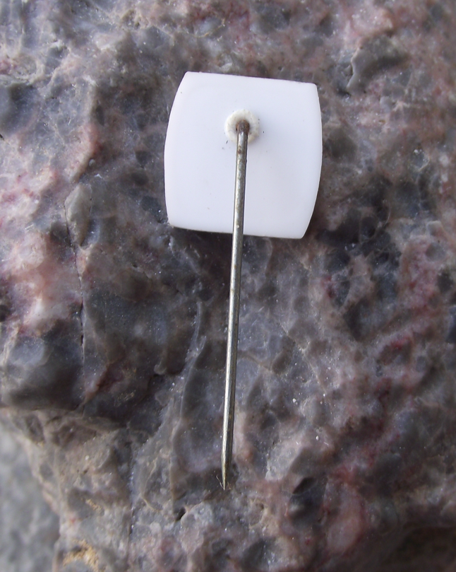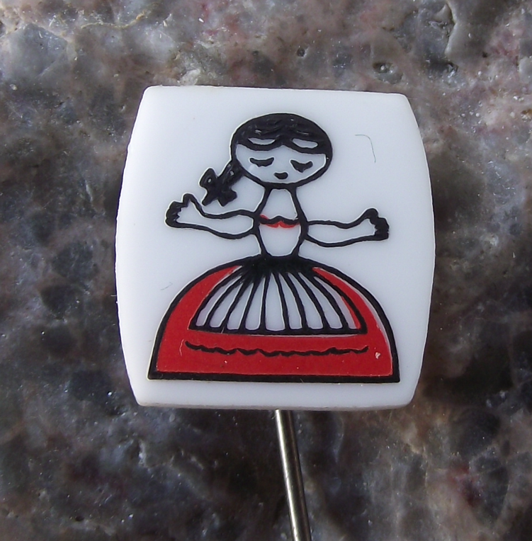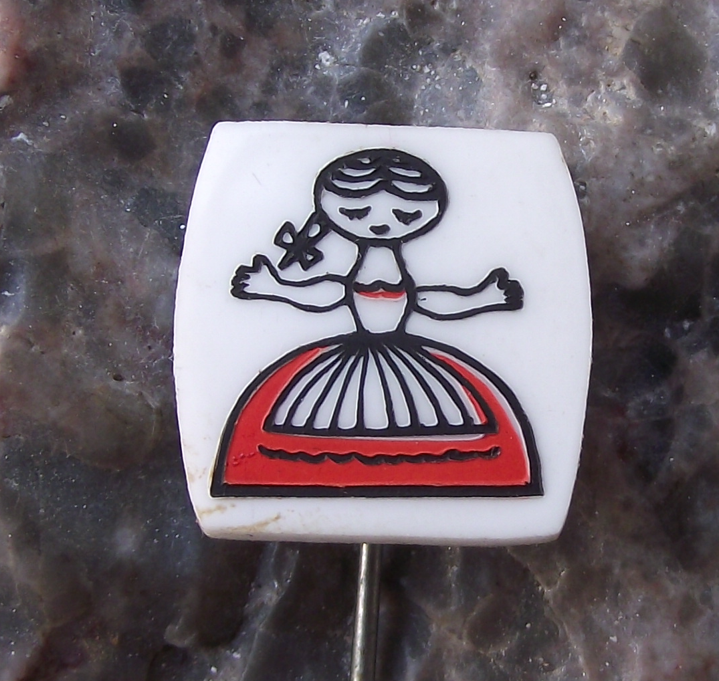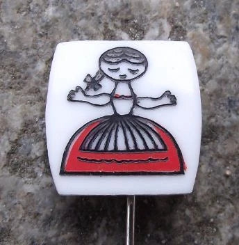 The pin on sale here is the unmistakable cartoon figure of Manka the wife of Rumcajs, it is made from white plastic with coloured enamel paints. It has a stick pin fastener and is 1.3cm high.