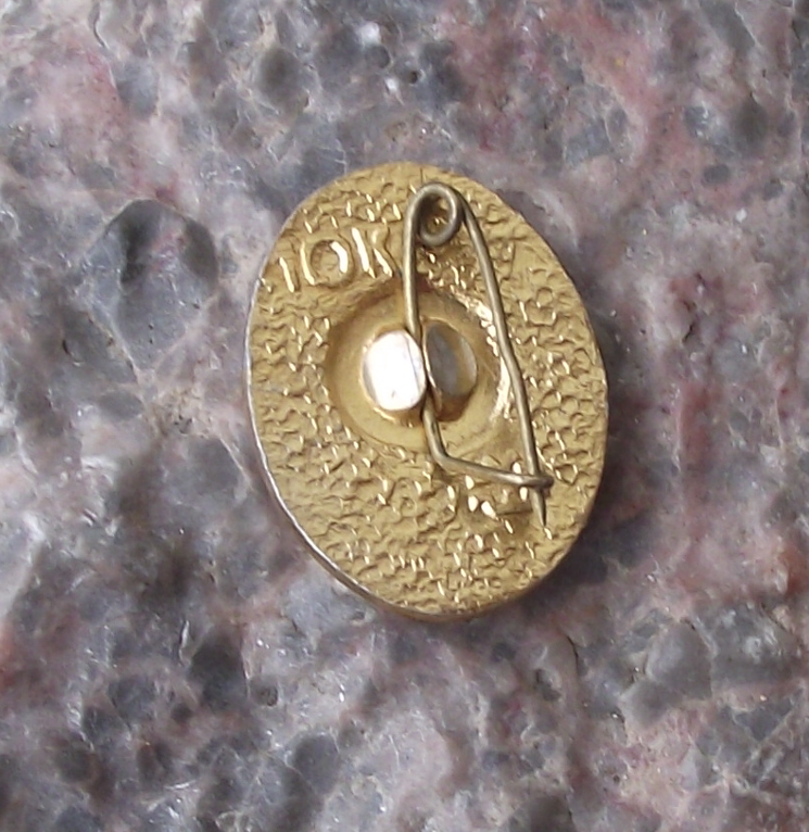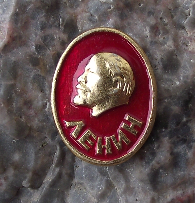 - An oval, Lenin pin badge, 1.9cm high, made of a gold coloured metal and featuring Lenin's head over the text LENIN.