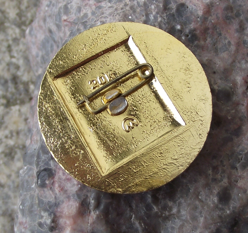 - A Lenin pin badge, 3.3cm in diameter, made of a gold coloured metal and featuring Lenin's head on a red carnation.