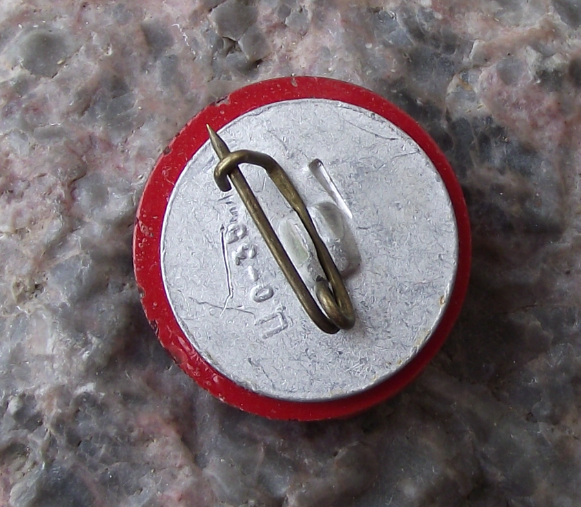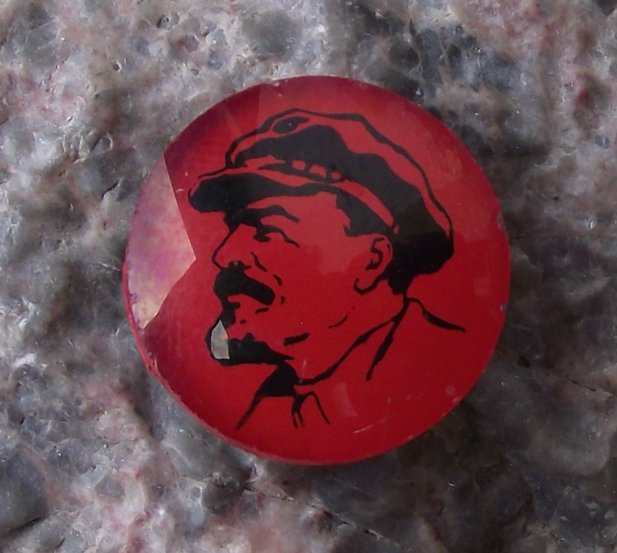 - A Lenin pin badge, 2.1cm in diameter, made from glass bonded onto a silver coloured metal clasp and featuring Lenin's head with flat cap.