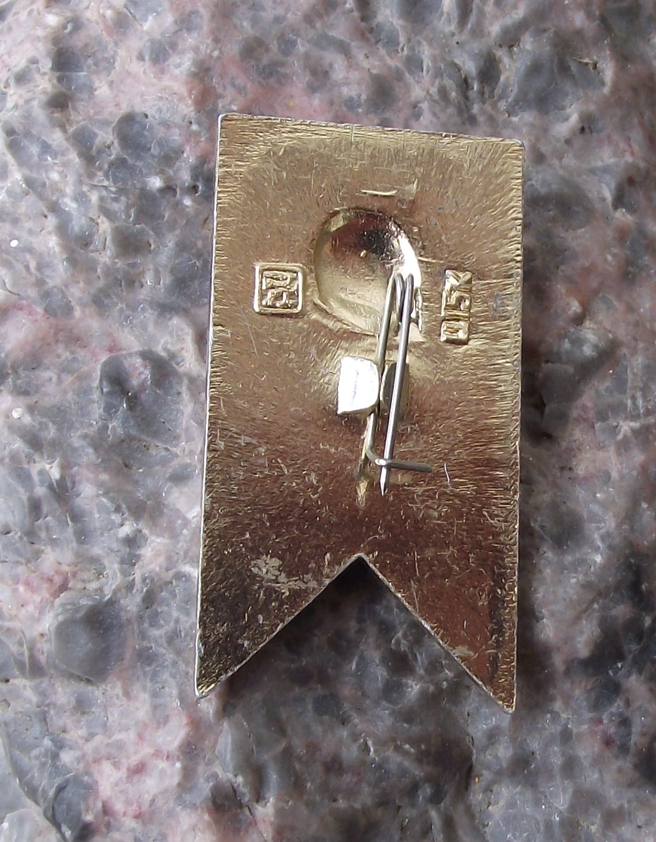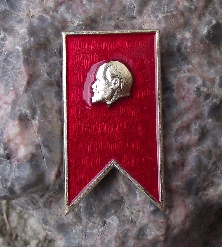 - A Lenin pin badge, 3.5cm high, made of a gold coloured metal and featuring Lenin's head on a red draped banner.