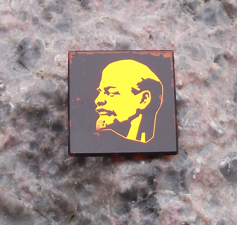 - A Lenin pin badge, 1.8cm in diameter, made of a silver coloured metal with clear glass mirrored section glued to it featuring the head of Lenin.