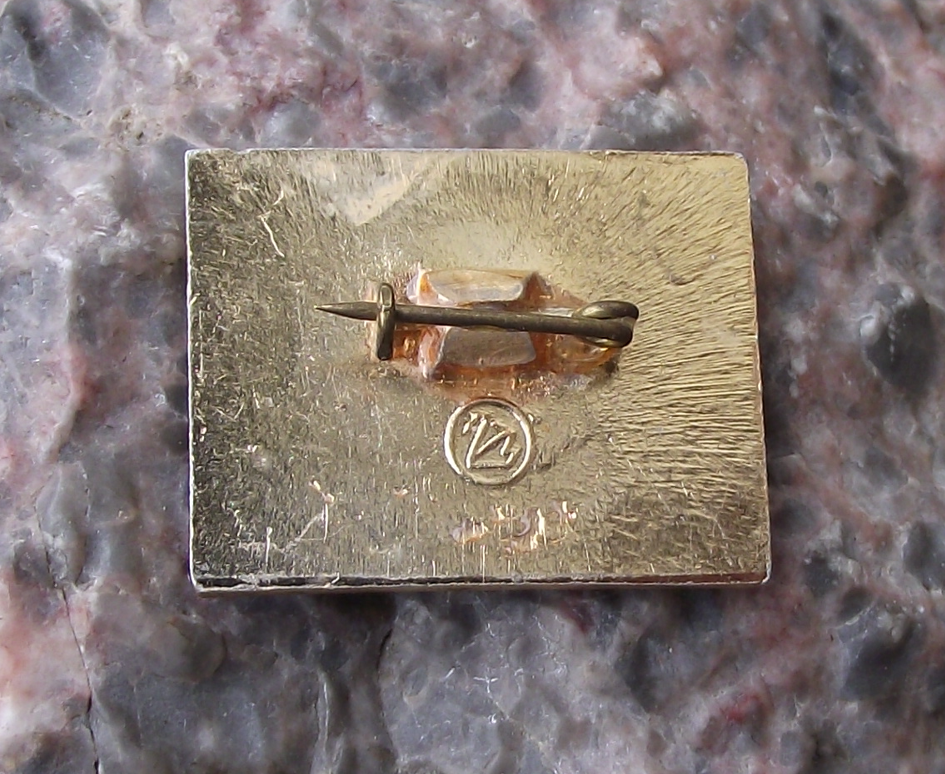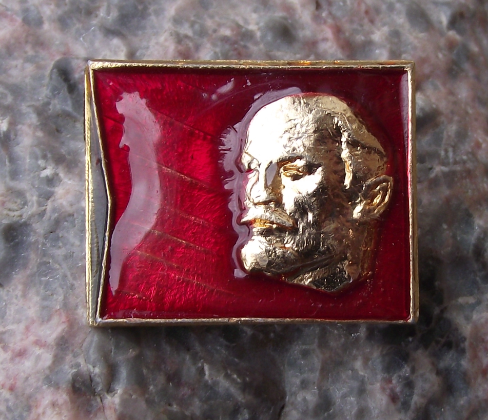 - A Lenin pin badge, 2.5cm wide, made of a gold coloured metal and featuring Lenin's head on a red flag.