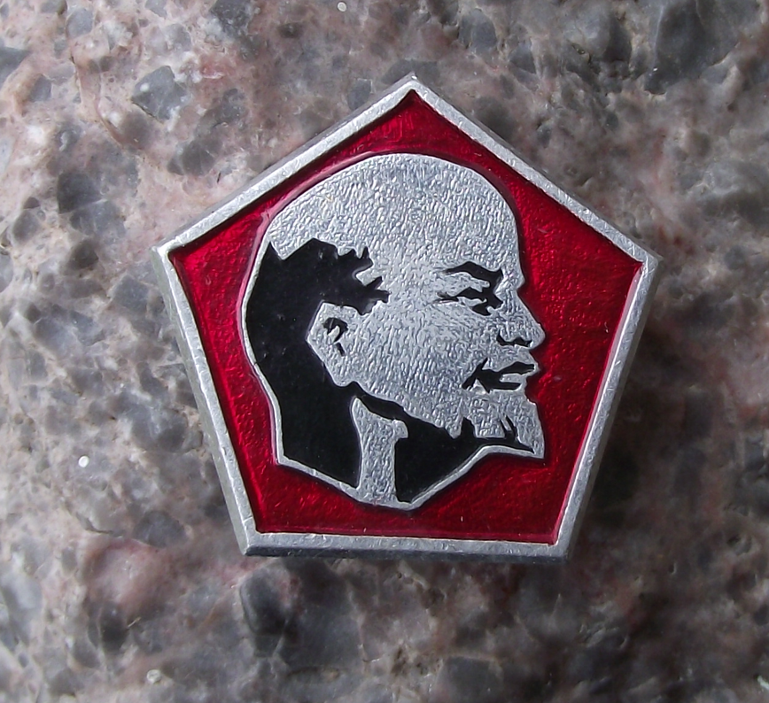 - A Lenin pin badge, 2.4cm wide, made of a silver coloured metal and featuring Lenin's head on a five sided pin badge.