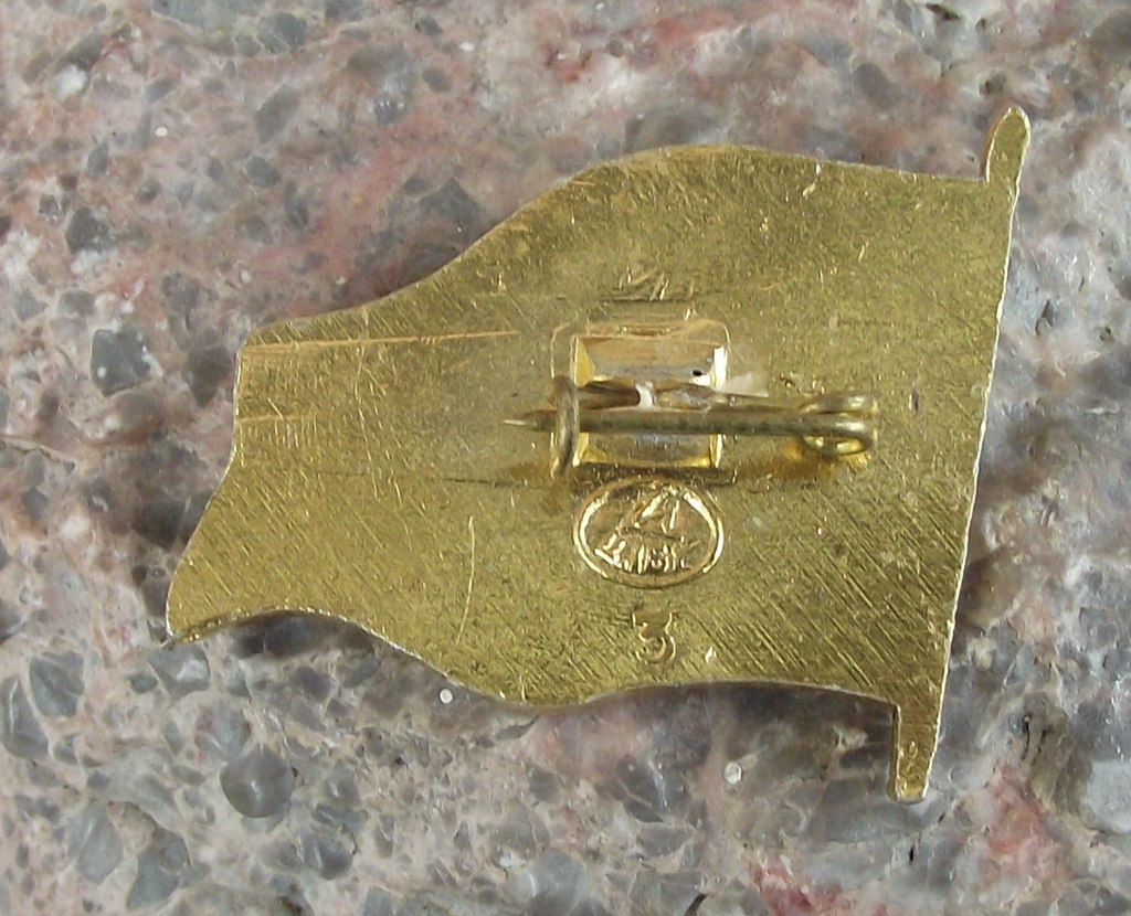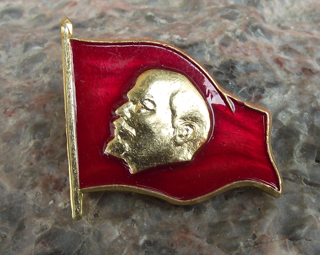 - A Lenin pin badge, 2.8cm wide, made of a gold coloured metal and featuring Lenin's head on a billowing red flag.
