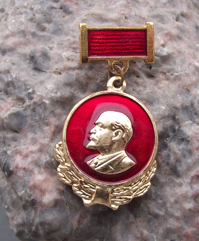 - A pretty, Lenin pin badge, 3.7cm high in total, made of a gold coloured metal and featuring a superbly detailed Lenin with a safety clasp style fastener to the rear of the 'ribbon' section.