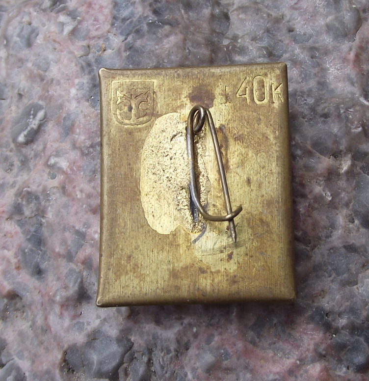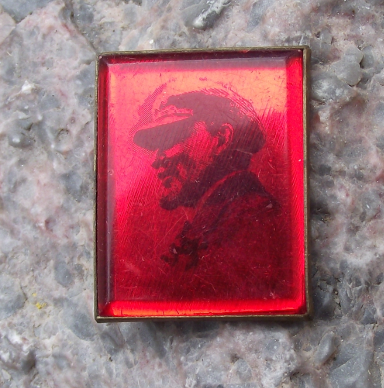 - A Lenin pin badge, 2.6cm high, made of a clear red plastic and backed with gold coloured metal and featuring Lenin's head with the familiar flat cap.