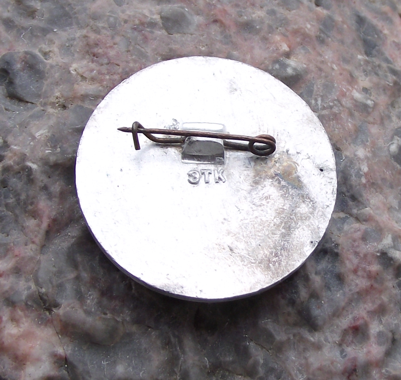 - A silver coloured, metal badge 2.6cm wide with a safety clasp style fastener to the rear.