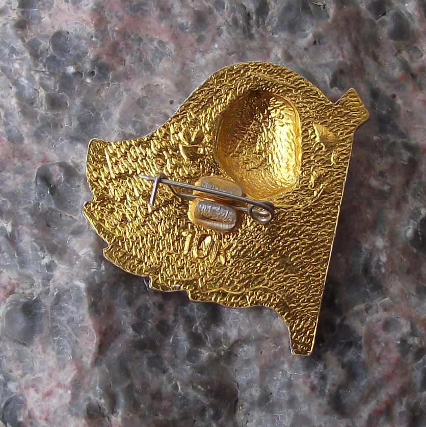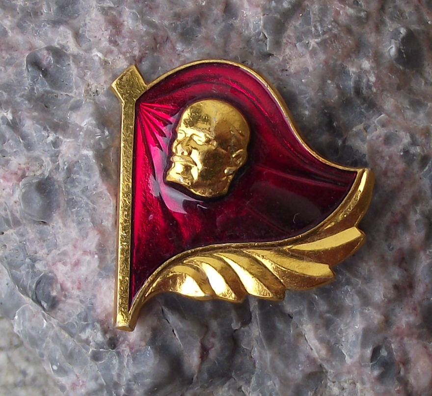 - A Lenin pin badge, 3cm wide, made of a gold coloured metal and featuring Lenin's head on a triangular red flag.