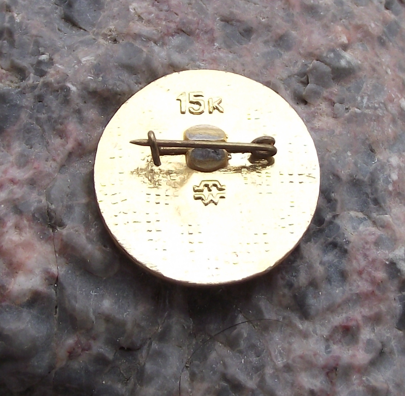 - A gold coloured, metal badge 2.3cm wide with a safety clasp style fastener to the rear.