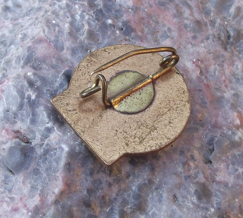 A gold metal badge with a 2.1cm high badge face and a safety clasp style fastener to the rear.