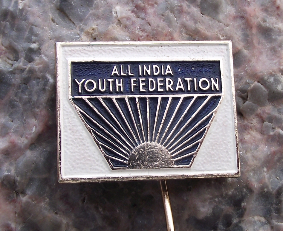 - A silver coloured metal badge with a 2.2cm wide badge face and a long stick pin style fastener to the rear. The badge features the text ALL INDIA YOUTH FEDERATION