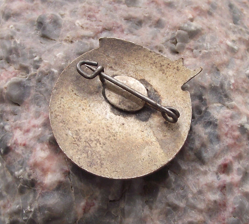 A silver metal badge with a 2.5cm high badge face and a safety clasp style fastener to the rear.